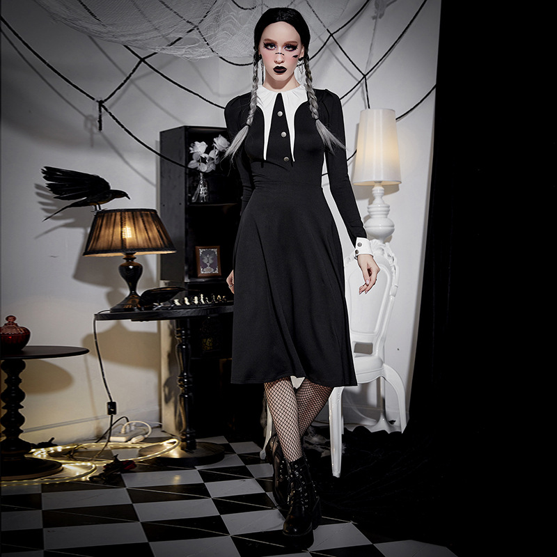 The most beautiful white pearlised floral fabric on the collar and cuffs provides an interesting added visual. A flattering and beautiful dress for any Spooky occasion!