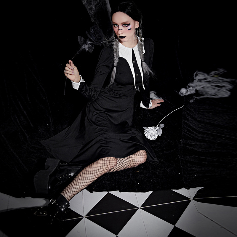 Large white batwing-inspired collars with gothic cross pendants at the end create a statement, while a vertical row of pearl buttons provide delicate feminine vibes.
