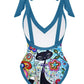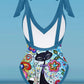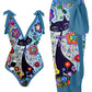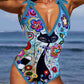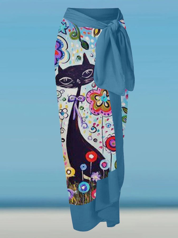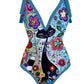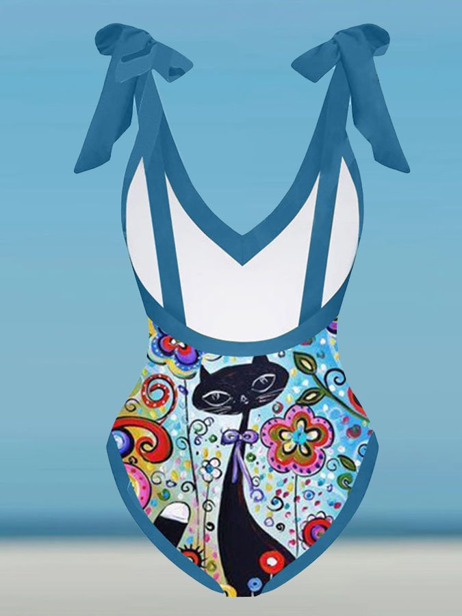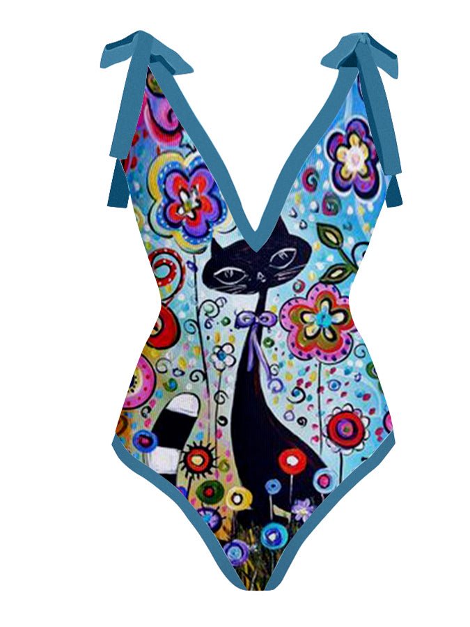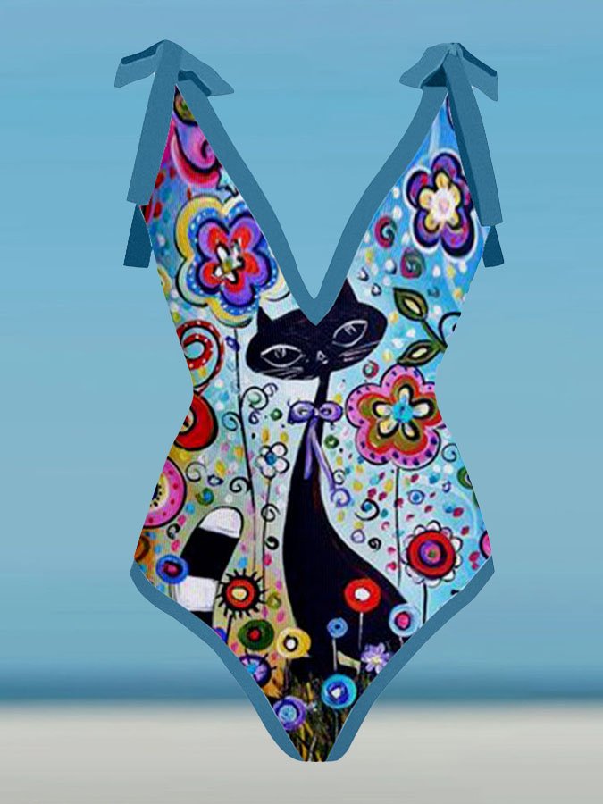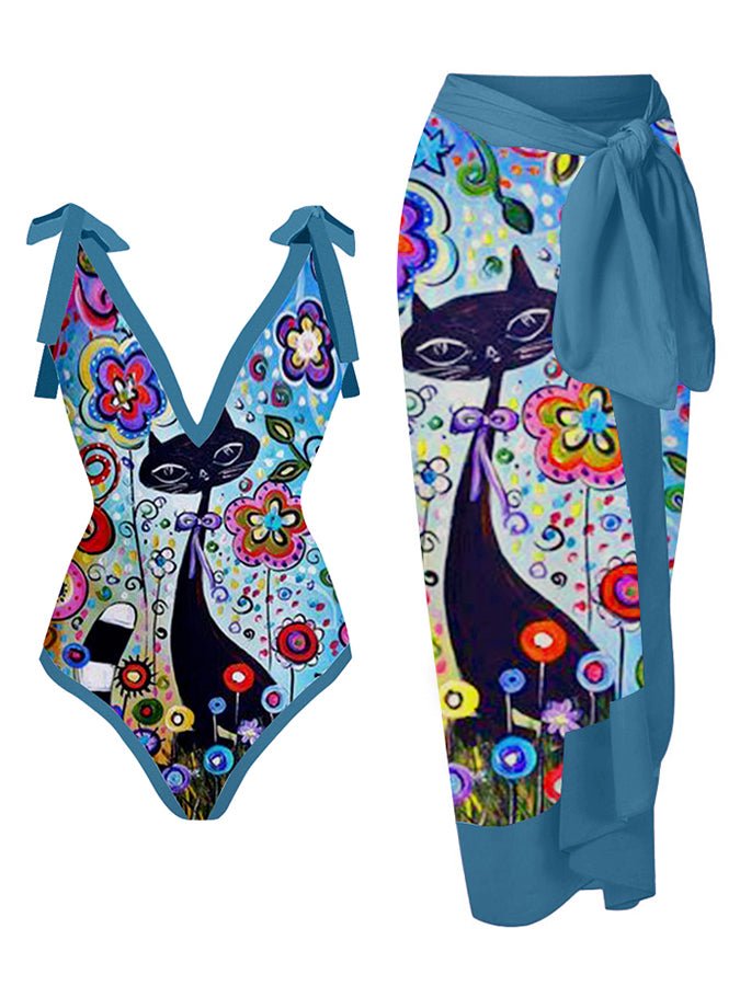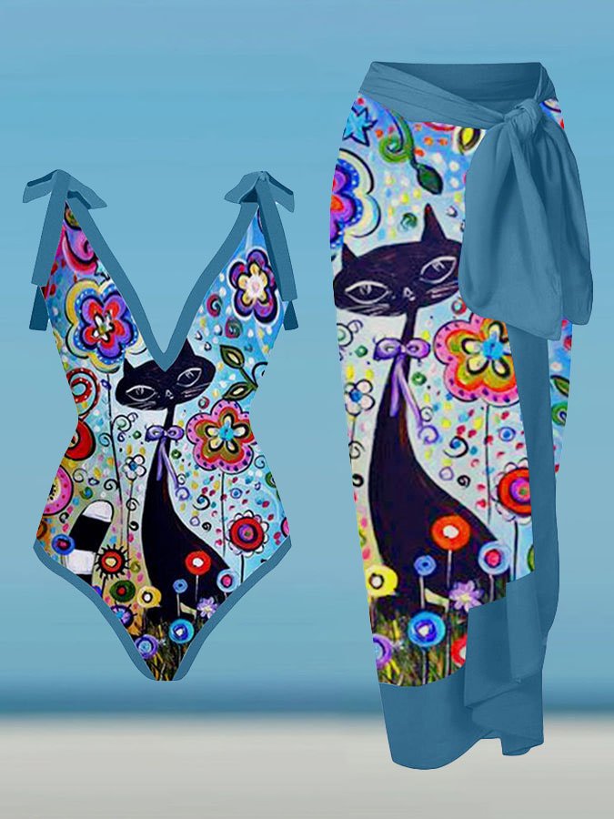 Fashion Cat Print V-Neck One-Piece Swimsuit Set