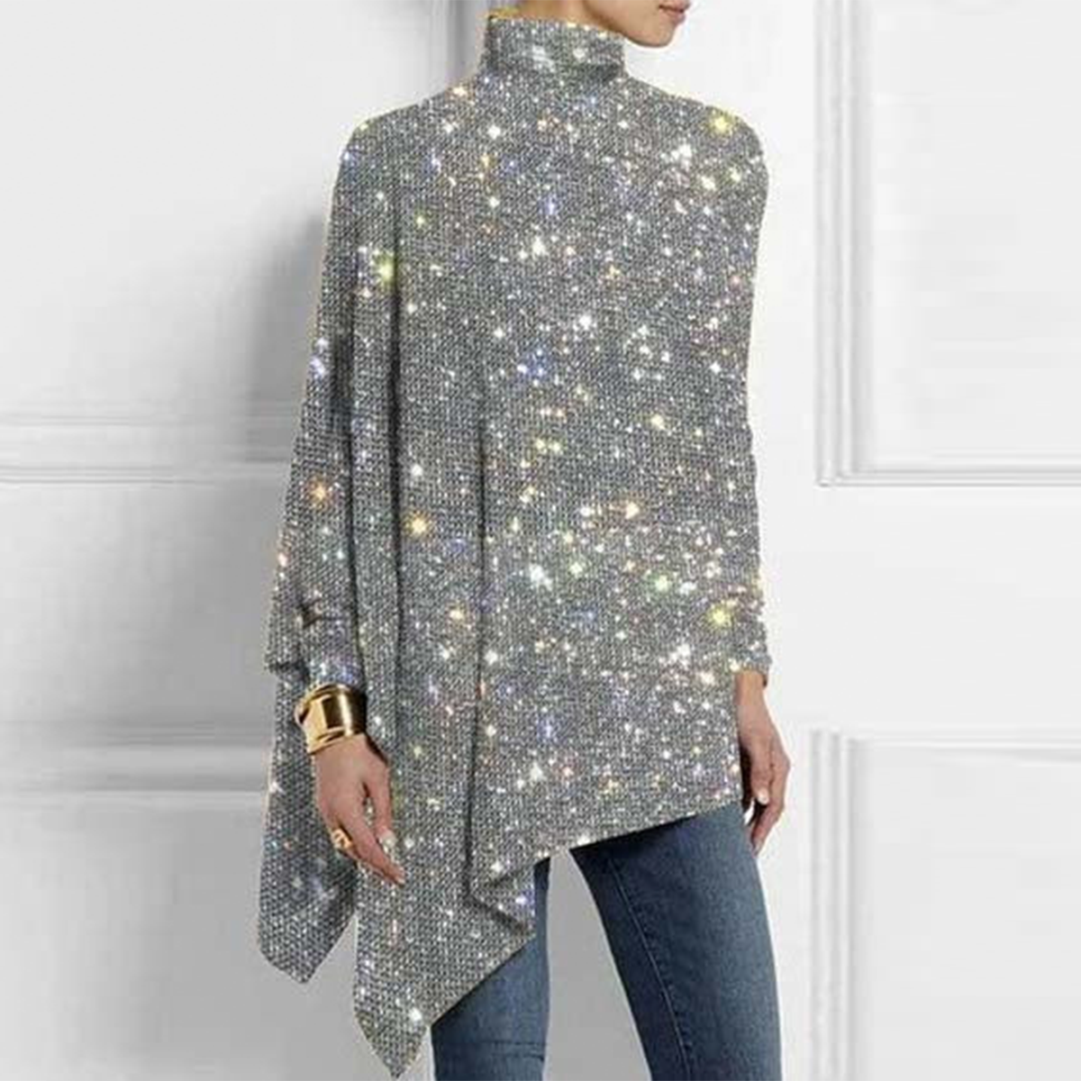 Chic Silver Print Mock Neck Top