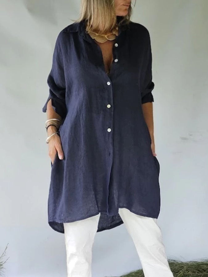 Women's Casual Solid Color Lapel Long Sleeve Button Cotton and Linen Shirt