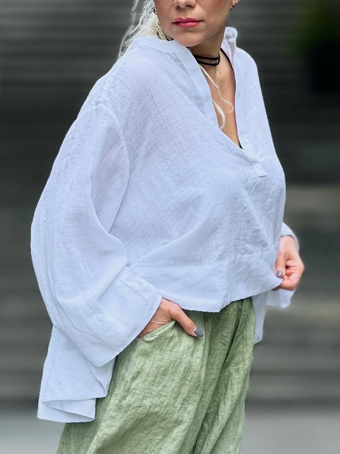 Women's Casual Solid Color V-Neck Long Sleeve Loose Top Cropped Shorts Set