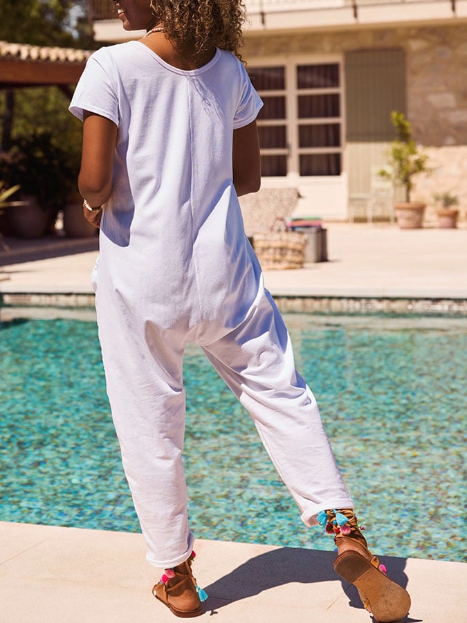 Women's Casual Solid Color V-Neck Short Sleeve Pocket Jumpsuit
